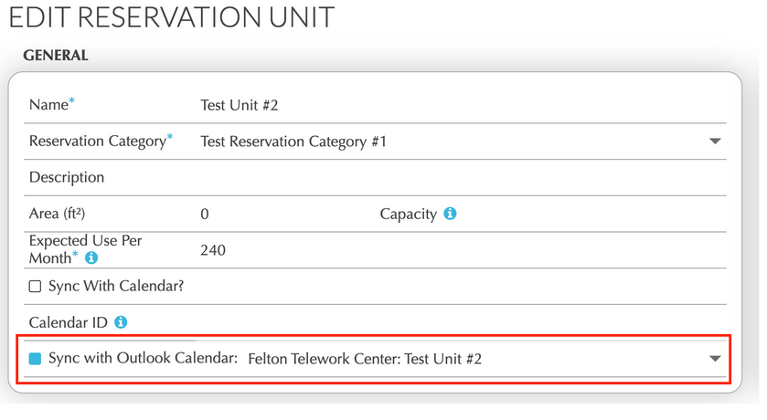 - Go to INVENTORY > RESERVATION UNITS and click the EDIT icon for any Reservation Units that you want to sync to Outlook, selecting the correct Outlook unit from the dropdown.